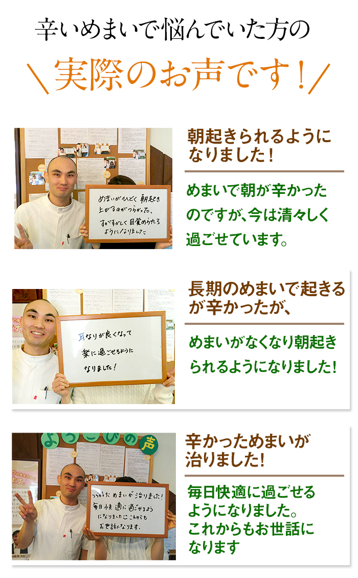 病院で診断を受け、薬やカウンセリングで治療をしてきた方。他の整骨院やマッサージなどでめまいを改善するために努力してきた方。様々な院で治療を受けると「本当に良くなるのか?」「自分に合った施術なのか?」と不安に思うことも多いはずです。