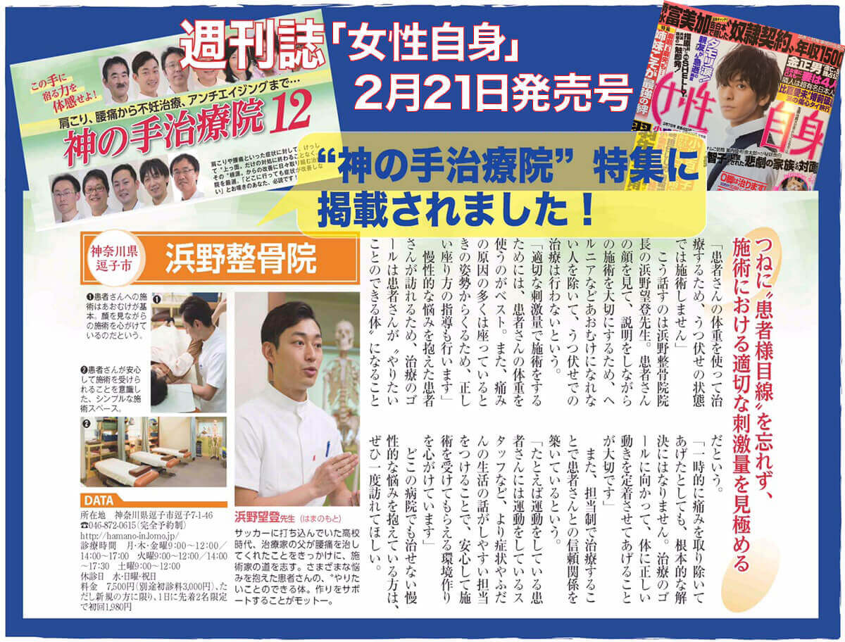 施術では医師の方に推薦を頂けることや、有名女性誌に掲載されるなどしているため確固たる自信はありますが、それ以上に浜野整骨院では患者様に寄り添い「安心してもらう」「喜んでもらう」ことを大切にしています。