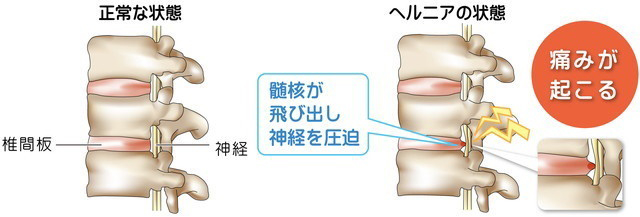 ヘルニアとは背骨の隙間にある椎間板が外に飛び出し神経を圧迫することで、痛みや痺れなどの症状を出します。