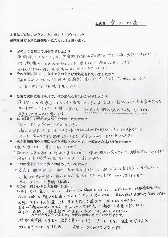椎間板ヘルニアによる坐骨神経痛の症状が出て、激痛、しびれで歩くことも座ることも横になることもできませんでした。今までどの治療してもその場限りですぐ戻ってしまい激痛で夜も眠れなかったのですが、浜野整骨院で治療を受けたその日から、朝まで眠れるようになれました!