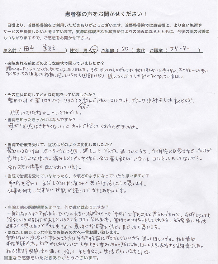 20代 女性 ※症状:腰椎椎間板ヘルニア
