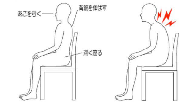 骨盤は後ろに倒れ、背中は丸まり猫背のような姿勢になっています。そうすると頭の位置は、本来背骨の真上にあるものが前に移動してきてしまい、首の骨にかかる負担が大きくなり、骨の隙間が狭くなってきてしまいます。そうするとます。