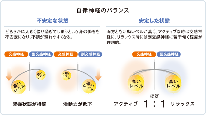自律神経という言葉は聞いたことがありますよね?でも実際どういったものか知っている方は少ないのではないでしょうか。自律神経とは交感神経と副交感神経という2つの神経から成り立ち、血管や内臓器などの自分の意志では調節できない部分のバランスを保ってくれています。自律神経失調症とはそのバランスが崩れ様々な症状を引き起こすものです。