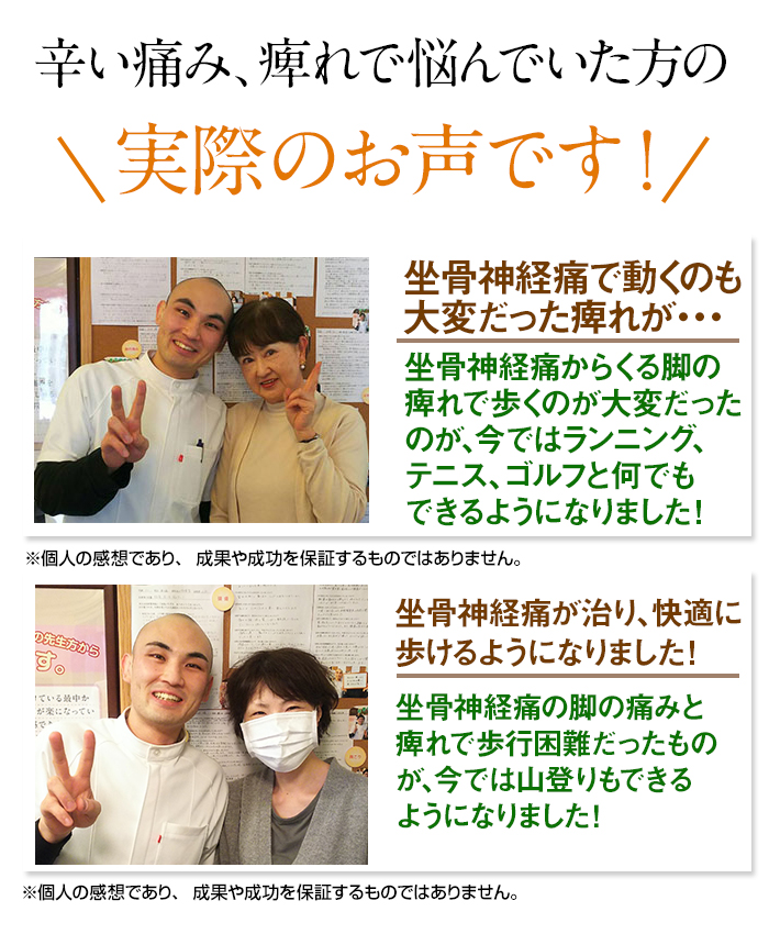 足を組んでいる姿勢が長いことや、以前足を捻挫したことが原因であることも多く、こういった1つ1つの体の歪みが神経を圧迫しているため、これらの歪みを改善することで、あなたと同じように悩んでいる坐骨神経痛の方が改善していっています。